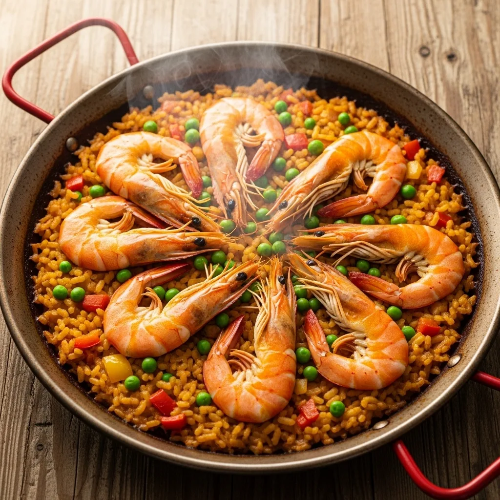 🍽️ Recipe: Sauté 50g bomba rice with 70g bell pepper. Add broth and simmer. Add 60g shrimp and 30g peas in last 5 minutes of cooking.