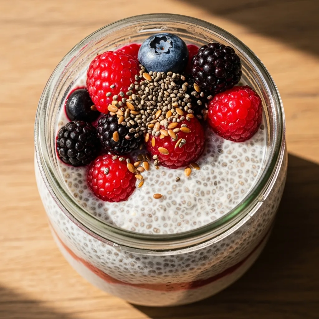 🍽️ Recipe: Mix 30g chia seeds with 150ml almond milk overnight. Top with 60g berries and 1 tsp flaxseeds.