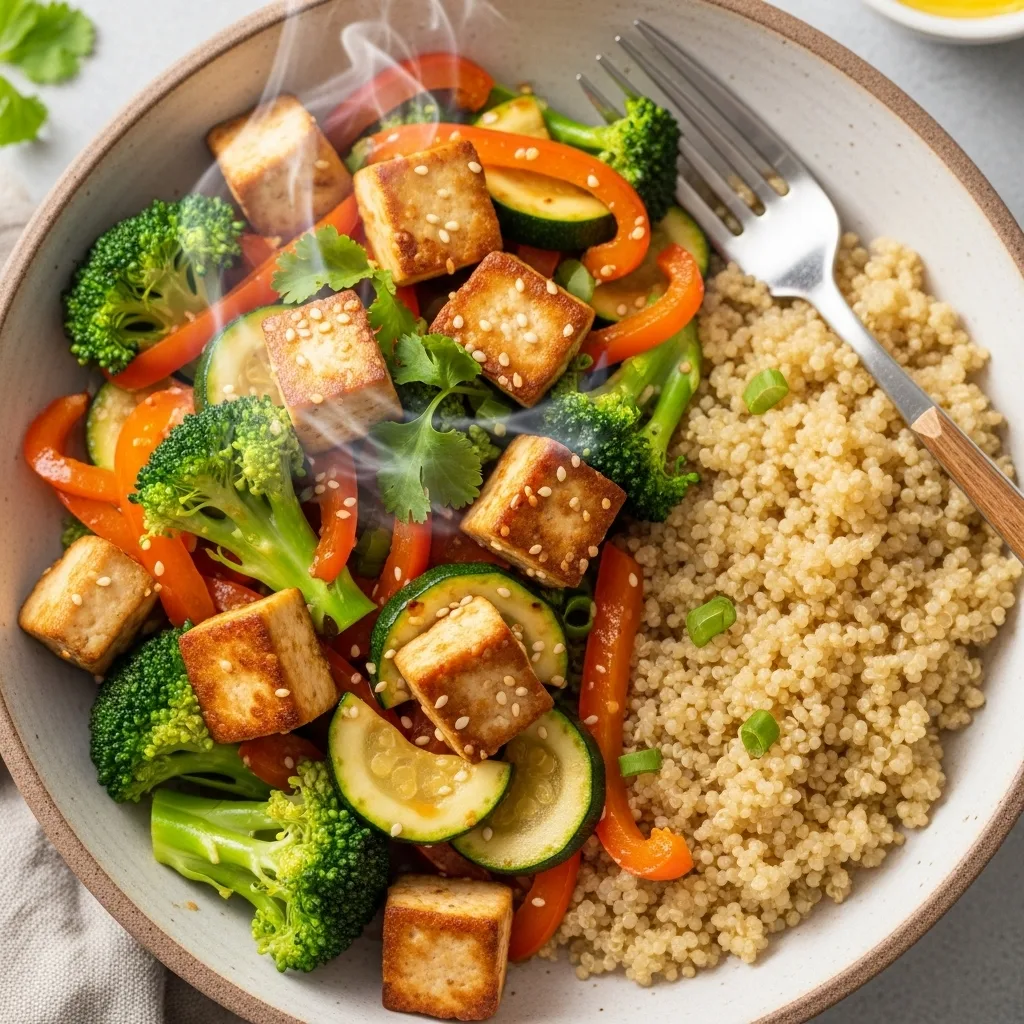 🍽️ Recipe: Press & cube 150g firm tofu. Stir-fry in 1 tsp sesame oil with 100g broccoli florets, 80g bell pepper strips, and 70g zucchini slices. Add 1 tbsp coconut aminos and 1 tsp lemon juice. Serve with 50g cooked quinoa (optional).