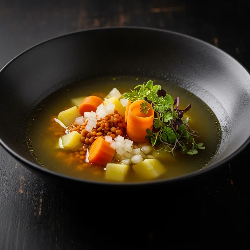🍽️ Recipe: Simmer 100g diced potatoes, 40g soaked red lentils, 50g carrots, 30g onions in 500ml vegetable broth until tender (25 mins).