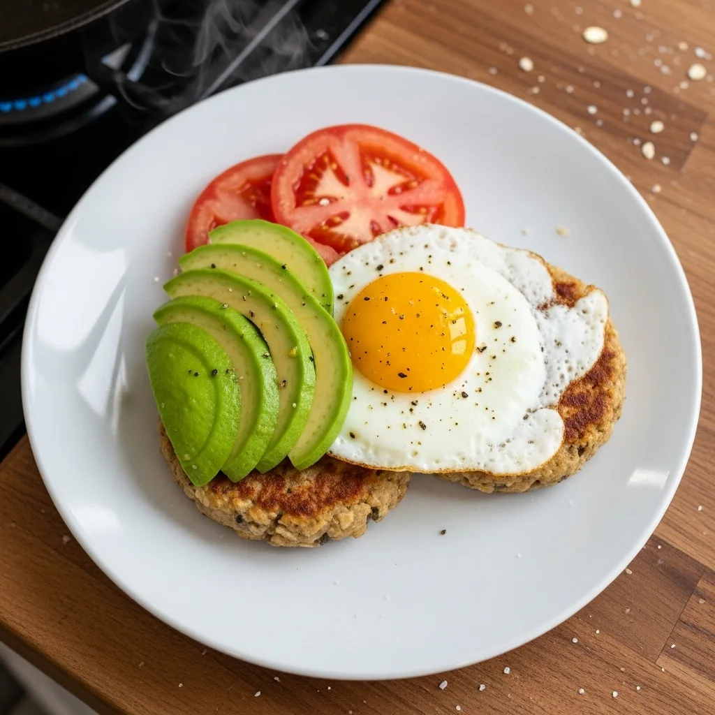 🍽️ Recipe: Pan-fry one oat patty (40g). Top with one fried egg (50g), 30g sliced avocado, and a thick slice of tomato (50g). Serve open-faced.