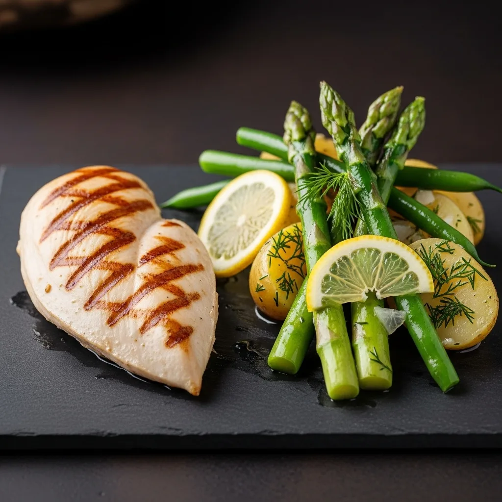 🍽️ Recipe: Grill 80g chicken breast. Blanch 100g asparagus and 80g green beans. Boil 100g new potatoes. Toss all together with a dressing of lemon juice, 1 tsp olive oil, and 10g fresh dill.