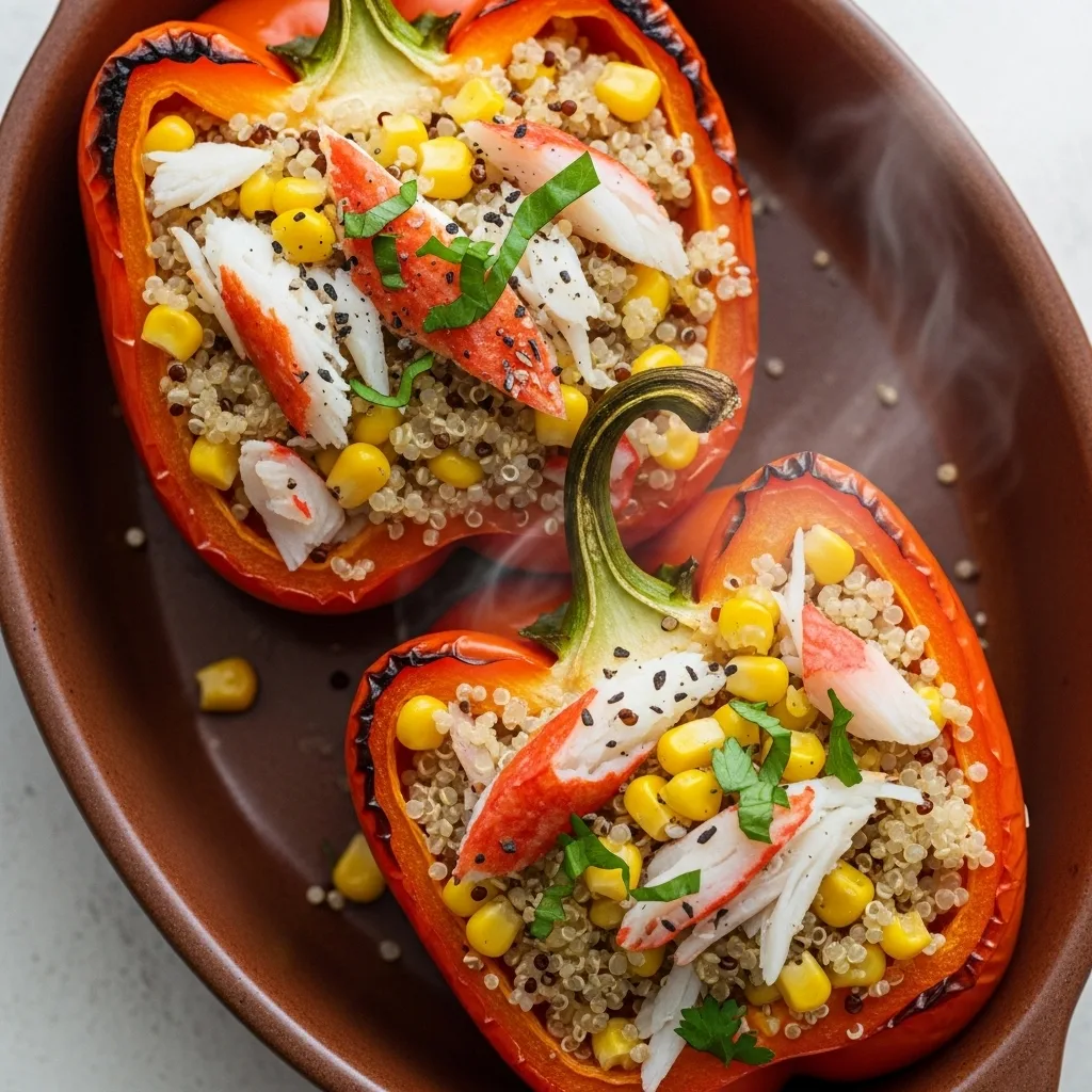 🍽️ Recipe: Roast 2 bell peppers (200g). Mix 50g crab with 60g cooked quinoa, 30g corn, and herbs. Stuff peppers and bake at 180°C for 15 mins.