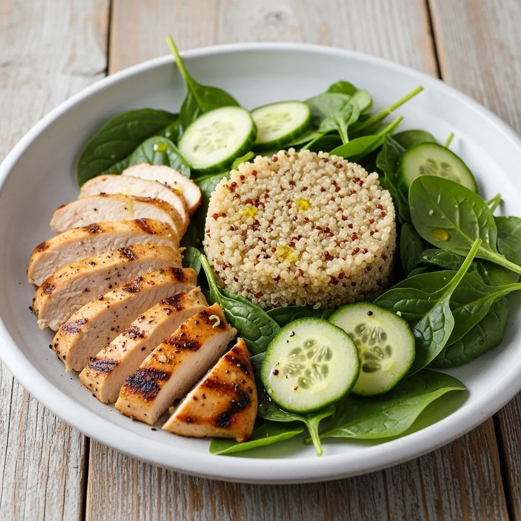 🍽️ Recipe: Grill 80g chicken breast. Blanch 100g asparagus and 80g green beans. Boil 100g new potatoes. Toss all together with a dressing of lemon juice, 1 tsp olive oil, and 10g fresh dill.