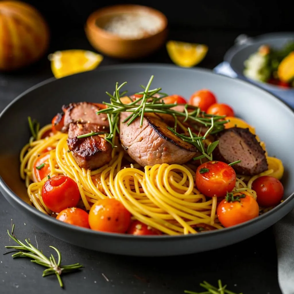 🍽️ Recipe: Pork & Squash Spaghetti “1. Roast 200g spaghetti squash. 2. Pan-sear 80g pork tenderloin with garlic and rosemary. 3. Toss with squash, 10 halved cherry tomatoes, 1 tsp olive oil, and lemon juice.”